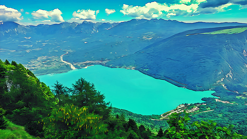 Dalla chiesa di Montanès (provincia di Belluno), dedicata a San Martino, si domina il Lago di Santa Croce. Lo sguardo si spinge dal Cansiglio al Col Visentin e alle dolomitiche pareti della Schiara.