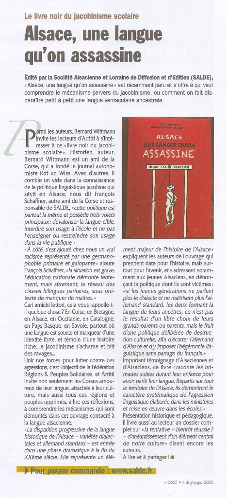Su “Arritti”, pubblicazione edita in Corsica, è apparsa una recensione di Max Simeoni su un libro scritto dal prof. Bernard Wittmann dal titolo “Alsace, un langue q’on assassine” (ed. SALDE), dedicato alla repressione subita dalla Lingua alsaziana da parte dello Stato francese. Un ulteriore contributo alla collaborazione tra i Popoli che oggi vivono sottomessi a Parigi.