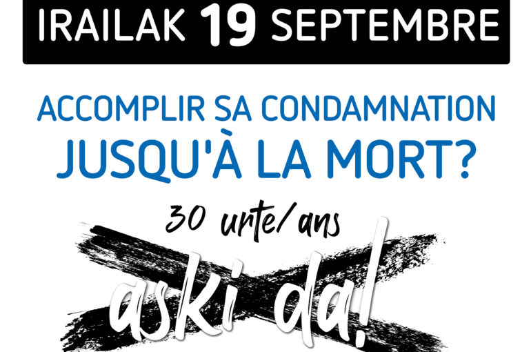 Accomplir sa condamnation jusqu’à la mort ? 30 ans ça suffit : cette dynamique a été lancée par les mouvements civils Bake Bidea et Les Artisans de la paix porteurs du processus. Nous nous insurgeons devant ces refus assimilés à une condamnation à mort lente ne disant pas son nom. Ceci dans le cadre d’un processus dont les grands axes restent le sort des prisonniers et des victimes du conflit, la construction d’espaces de dialogue et d’un vivre-ensemble pour tous.
