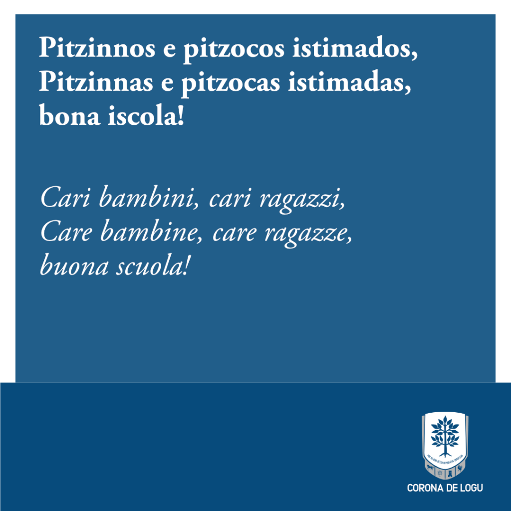 Isperamus e bos auguramus chi andet totu bene. Semus seguros chi fintzas custu at a èssere un’annu iscolàsticu cun amighèntzias noas, esperièntzias bonas, tocheddos de coro e satisfatziones, connoschèntzias noas in totu sas matèrias chi ais a praticare in classe e in sos libros. Pro custu isperamus chi sos maistros e sos professores bostros bos content s’istòria de sa Sardigna e de su pòpulu suo, sa cultura nostra, e chi sos meses imbenientes cumintzedas una cosa noa: chistionade in sardu intre bois e cun sos professores, in classe. Pedide custa cosa, si non càpitat: est unu deretu bostru.