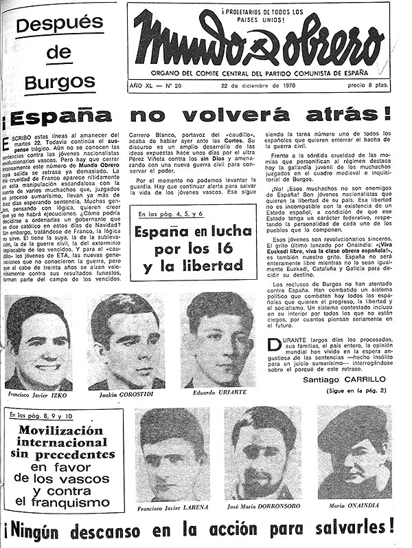 Il processo che si svolgerà due anni dopo a Burgos rappresenta anche una risposta e una rappresaglia per questa esecuzione. Numerosi militanti vengono giudicati da un tribunale militare e contro nove di loro vengono emesse condanne a morte. A impedirne l’effettiva attuazione contribuirà sicuramente la vigorosa, massiccia protesta popolare che dal paese Basco si estende presto in tutta l’Europa.