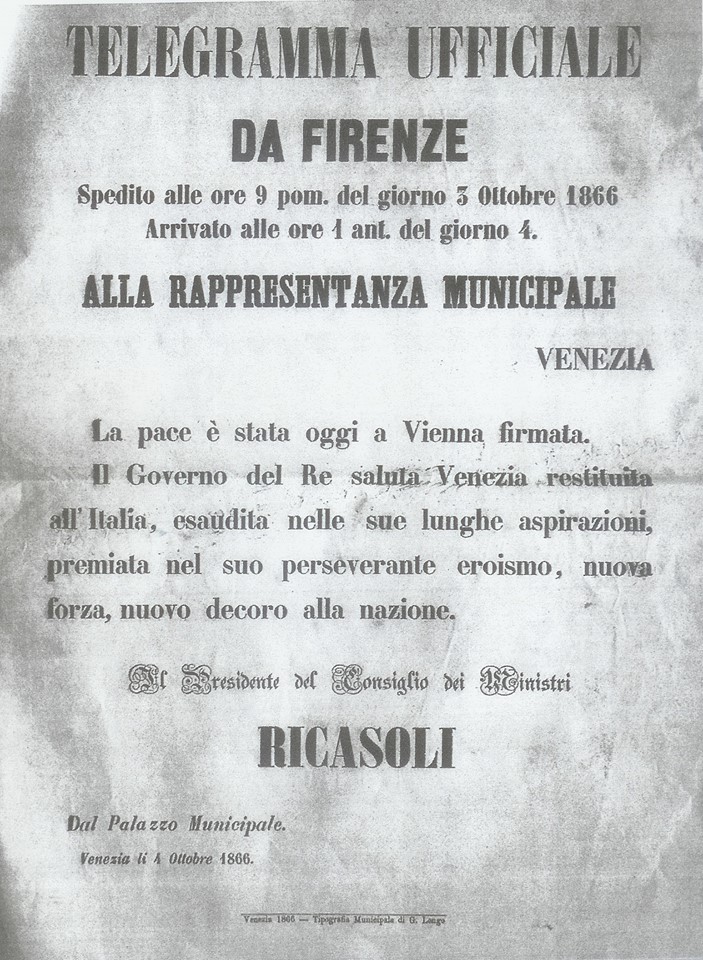 Il 3 ottobre 1866 veniva firmato a Vienna il trattato di pace fra l’Italia e l’Austria con il quale si poneva fine alla cosiddetta terza guerra di indipendenza. L’Italia era entrata in guerra il 20 giugno 1866 per “liberare” il Veneto ed si era alleata con la Prussia, in funzione anti austriaca; gli italiani erano stati sconfitti sia per terra (Custoza, 24 giugno) che per mare (Lissa, 20 luglio) ma la devastante vittoria dell’esercito prussiano a Sadowa era stata determinante per costringere l’Austria a chiedere la pace; l’Italia pur così pesantemente sconfitta si sedeva al tavolo dei vincitori grazie alla potenza dell’alleato prussiano. L’impero asburgico, però, proprio per rimarcare tutto questo, e cioè che non si poteva considerare i Savoia come dei vincitori, si rifiutò di consegnare direttamente il Veneto al Regno d‘Italia e lo consegnò alla Francia affinché facesse da garante internazionale, un po’ come l’ONU ai giorni nostri, per intendersi. Il Veneto sarebbe eventualmente passato al Regno d’Italia solo dopo un libero voto, “sotto riserva del consenso delle popolazioni debitamente consultate” è la formula testuale del trattato di pace: in quel preciso momento un trattato internazionale riconosce ai veneti quello che oggi si chiama “diritto di autodeterminazione”; sarebbero stati i veneti a decidere il loro futuro attraverso la libera espressione del voto. Il diritto di autodeterminazione è un diritto “naturale” che viene prima del diritto degli stati, ed è un diritto inalienabile dei popoli, questo dovrebbe essere compreso anche a Roma, dove invece ci si ostina a portare avanti un atteggiamento irrispettoso dei diritti dei popoli. Dopo quel trattato di pace, sappiamo purtroppo, come andarono le cose: il plebiscito viene convocato per i giorni 21 e 22 ottobre, ma su pressione del governo italiano, il 19 ottobre, due giorni prima del voto, il Veneto passa ai Savoia in una oscura stanza dell’Hotel Europa lungo il Canal Grande: i Veneti vanno a votare quando tutto è già stato deciso… Per non parlare di come si svolsero le operazioni di voto: schede di colore diverso e obbligo di dichiarare le proprie generalità! Ecco quanto successe a Malo (Vi): “Le autorità comunali avevano preparato e distribuito dei biglietti col SI e col NO di colore diverso; inoltre ogni elettore presentandosi ai componenti del seggio pronunciava il proprio nome e consegnava il biglietto al presidente che lo depositava nell’urna”; altro che segretezza del voto, altro che controlli internazionali! Il plebiscito è stato una grande grande truffa, la prima di una serie interminabili di truffe che i governi italiani hanno perpetrato nei confronti dei veneti: emblematico quanto viene entusiasticamente enunciato nel telegramma del presidente del consiglio dei ministri, B. Ricasoli, nel quale si afferma che Venezia è restituita all’Italia ignorando quanto il Regno d’Italia si era impegnato a garantire il giorno prima: “sotto riserva del consenso delle popolazioni debitamente consultate” …