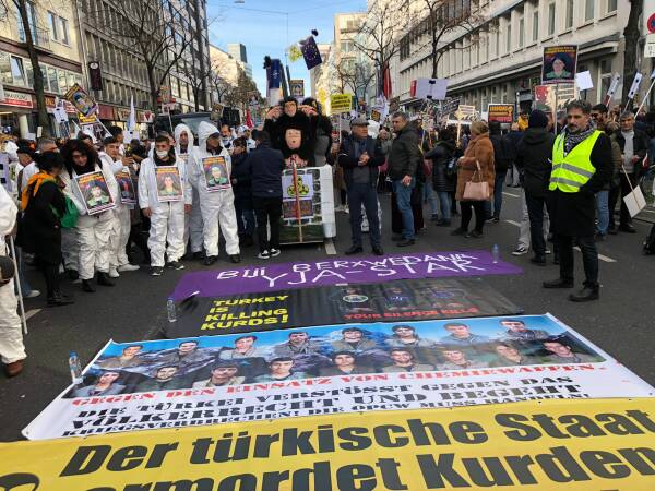 “L’attacco contro il Kurdistan è un attacco contro i nostri valori”, “Fermate il sostegno tedesco alla Turchia”, “Lo Stato turco assassina i Curdi con le armi chimiche – Il vostro silenzio uccide”.