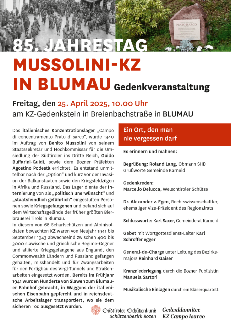 Come ogni anno, il Südtiroler Heimatbund ricorda coloro che furono detenuti nel Campo di concentramento fascista di Blumau (BZ), alla presenza di numerosi ospiti e relatori, nella speranza che queste pagine buie della Storia non si ripetano più.